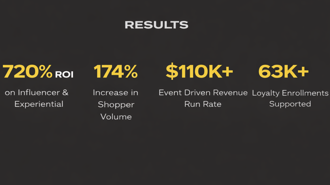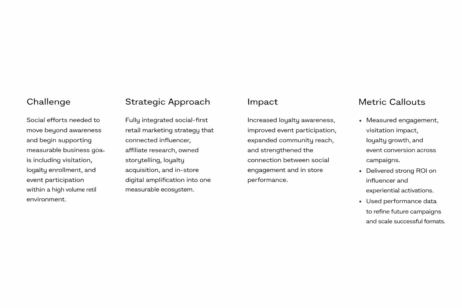 Campaigns included influencer collaborations, student and community partnerships, in-store activations, and social-first event promotion, all measured against traffic, loyalty enrollment, engagement, and revenue performance.