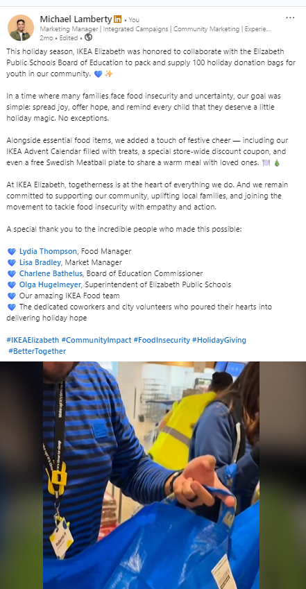 As the Local Marketing Specialist at IKEA Elizabeth, I lead localized social and digital marketing initiatives that bridge IKEA’s global brand strategy with meaningful, community-driven storytelling. I oversee organic social strategy, short-form video, event promotion, influencer partnerships, and loyalty-focused campaigns designed to drive engagement and participation. My role involves close collaboration with internal cross-functional teams and external community partners to plan, execute, and amplify integrated campaigns. Through a combination of creative storytelling, strategic planning, and performance tracking, I help strengthen brand relevance, increase loyalty awareness, and support omnichannel impact.